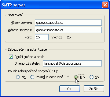 V "Zabezpečení a autentizace" vybete u položky "Použít zabezpečené spojení (SSL)" - TLS - OK